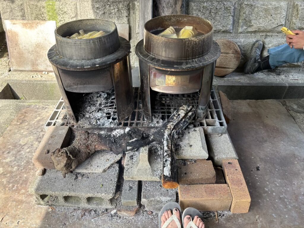 この“巨大な窯で一気に湯がける”のは、田舎の家ならではの贅沢。火の番をしているのものんびりできて好きな時間。