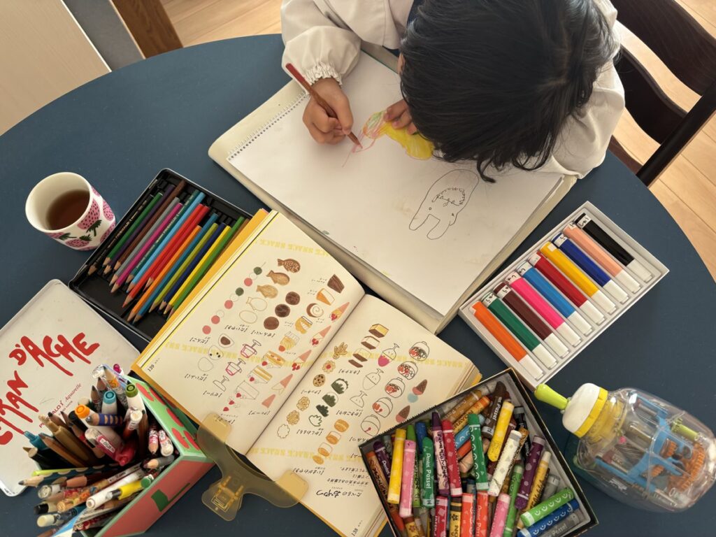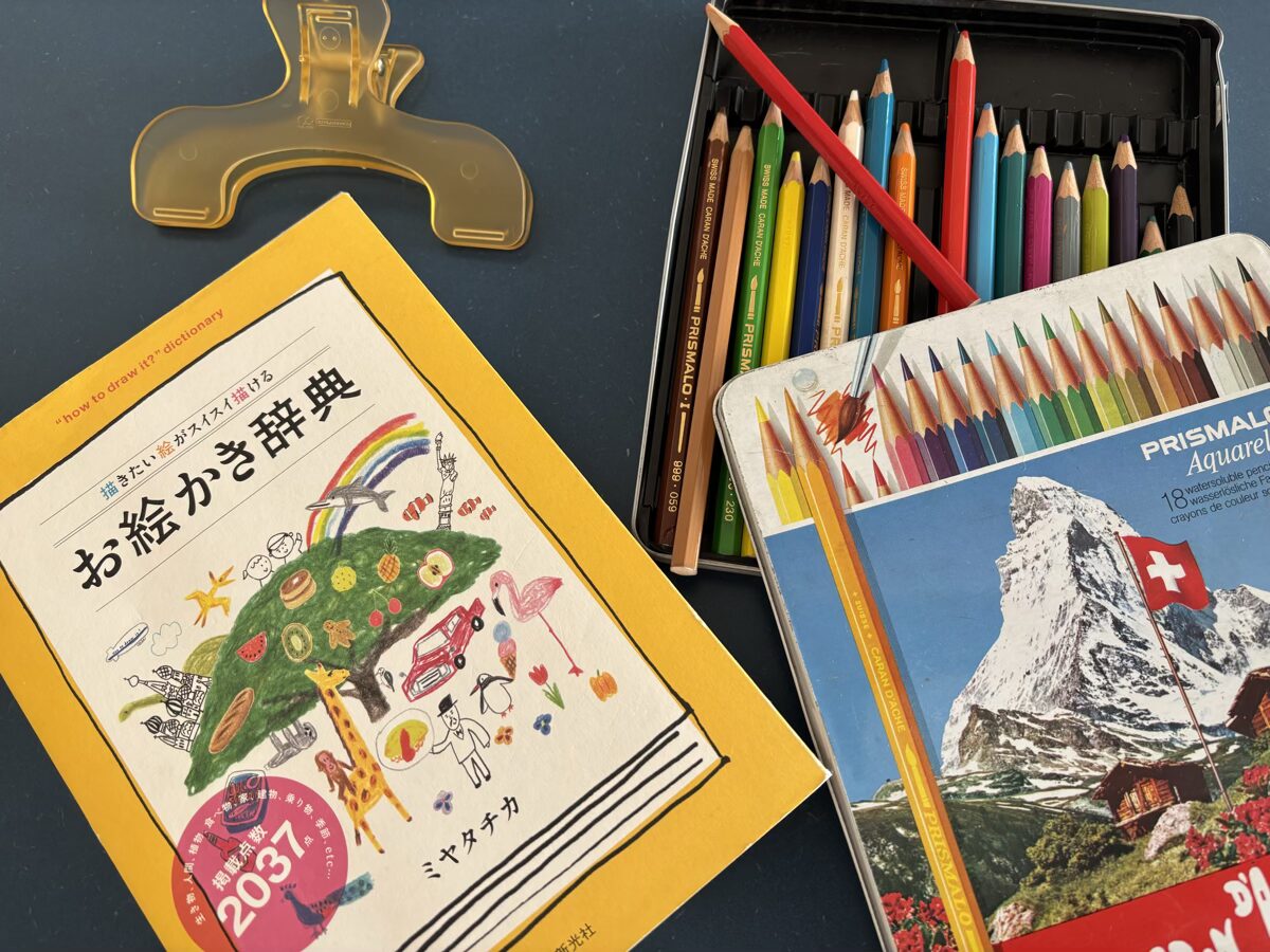 先日、本屋さんでふらっと見つけた『お絵かき辞典 描きたい絵がスイスイ描ける』を開いて、「今日は何を描こうか」と相談しながら色鉛筆を手に取る。アイスクリーム、スイカ、お花、リスなどなど色々チャレンジしている。